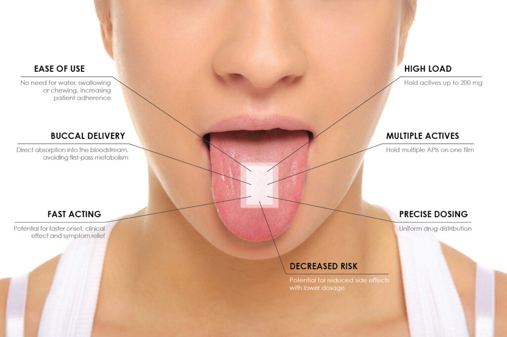 HarmonyFilm™ products are about the size of a stamp, and can deliver therapeutic actives through the oral mucosal tissue sublingually or buccally. Oral transmucosal drug delivery is a non-invasive route that allows for the active ingredients to be absorbed directly into the vascularized tissue in the mouth, bypassing the hepatic first pass effect. This leads to reduced drug exposure and can offer a rapid onset of action.